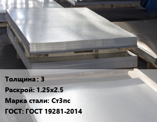 Лист горячекатаный 3 1.25х2.5 Сталь: Ст3пс ГОСТ: ГОСТ 19281-2014