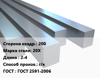Квадрат стальной 200 Сталь: 20Х L=2-4 г/к ГОСТ 2591-2006