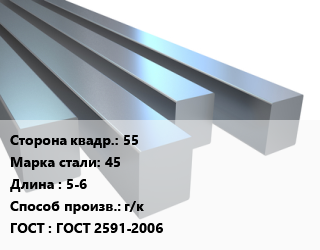 Квадрат стальной 55 Сталь: 45 L=5-6 г/к ГОСТ 2591-2006