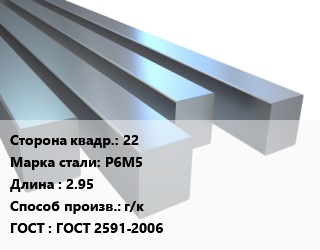 Квадрат стальной 22 Сталь: Р6М5 L=2.95 г/к ГОСТ 2591-2006