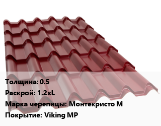 Металлочерепица 0.5 1.2хL Марка: Монтекристо M Покрытие:Viking MP, м2, бутылочно-зеленый,зеленый мох,коричневая медь,коричневый шоколад,красное вино,серо-коричневый,серый графит,темно-коричневый,черный темный, RAL 6007,RAL 6005,RAL 8004,RAL 8017,RAL 3005,RAL 8019,RAL 7024,RR32,RAL 9005 цена от 1 011 Р / м2, где купить, условия доставки в Могилеве и Могилёвской области
