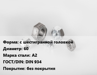 Гайка с шестигранной головкой D=60 Сталь: А2 DIN 934 без покрытия, кг, по запросу цена от 301.82 Р / кг, где купить, условия доставки в Могилеве и Могилёвской области