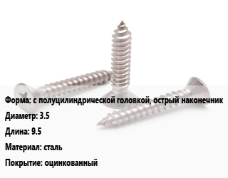 Саморез с полуцилиндрической головкой, острый наконечник D=3.5 L=9.5 сталь оцинкованный