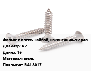 Саморез с пресс-шайбой, наконечник-сверло D=4.2 L=16 сталь RAL 8017, шт, для металла,для оконного профиля цена По запросу где купить, условия доставки в Могилеве и Могилёвской области