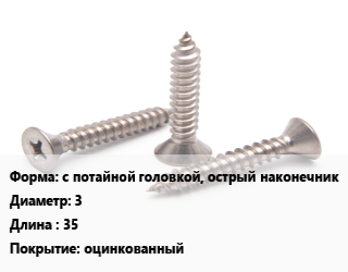 Саморез с потайной головкой, острый наконечник D=3 L=35 оцинкованный