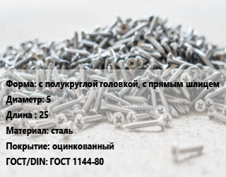 Шуруп с полукруглой головкой, с прямым шлицем 5х25 сталь оцинкованный ГОСТ: ГОСТ 1144-80