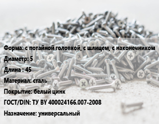 Шуруп с потайной головкой, с шлицем, с наконечником 5х45 сталь белый цинк ГОСТ: ТУ BY 400024166.007-2008 универсальный