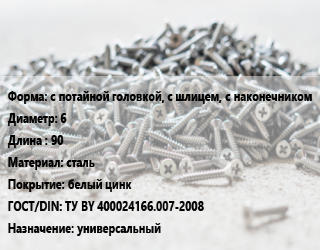Шуруп с потайной головкой, с шлицем, с наконечником 6х90 сталь белый цинк ГОСТ: ТУ BY 400024166.007-2008 универсальный, кг цена от 272.42 Р / кг, где купить, условия доставки в Могилеве и Могилёвской области