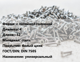 Шуруп с потайной головкой 4х12 сталь белый цинк ГОСТ: DIN 7505 универсальный