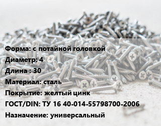 Шуруп с потайной головкой 4х30 сталь желтый цинк ГОСТ: ТУ 16 40-014-55798700-2006 универсальный