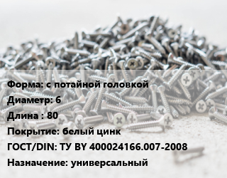 Шуруп с потайной головкой 6х80 белый цинк ГОСТ: ТУ BY 400024166.007-2008 универсальный, упаковка 1000 шт, РечМЗ цена от 2 416 Р / кг, где купить, условия доставки в Могилеве и Могилёвской области