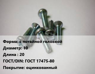 Винт с потайной головкой 10х20 ГОСТ 17475-80 оцинкованный, упаковка 1000 шт,упаковка 5 кг, кг цена от 426.38 Р / кг, где купить, условия доставки в Могилеве и Могилёвской области