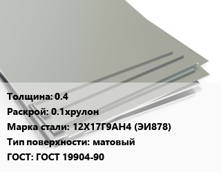 Лист нержавеющий 0.4 0.1хрулон Сталь: 12Х17Г9АН4 (ЭИ878) Тип:матовый ГОСТ 19904-90, х/к, по запросу цена от 277 693 Р / т, где купить, условия доставки в Могилеве и Могилёвской области