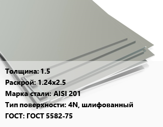 Лист нержавеющий 1.5 1.24х2.5 Сталь: AISI 201 Тип:4N, шлифованный ГОСТ 5582-75