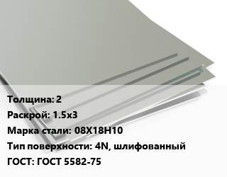 Лист нержавеющий 2 1.5х3 Сталь: 08Х18Н10 Тип:4N, шлифованный ГОСТ 5582-75