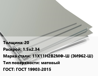 Лист нержавеющий 20 1.5х2.34 Сталь: 11Х11Н2В2МФ-Ш (ЭИ962-Ш) Тип:матовый ГОСТ 19903-2015