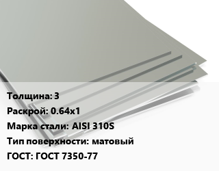 Лист нержавеющий 3 0.64х1 Сталь: AISI 310S Тип:матовый ГОСТ 7350-77