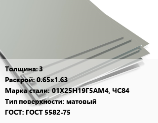Лист нержавеющий 3 0.65х1.63 Сталь: 01Х25Н19Г5АМ4, ЧС84 Тип:матовый ГОСТ 5582-75