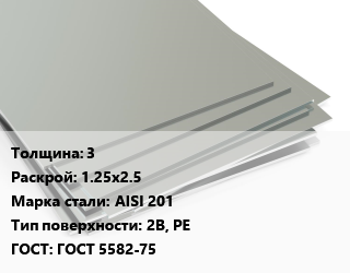 Лист нержавеющий 3 1.25х2.5 Сталь: AISI 201 Тип:2B, PE ГОСТ 5582-75