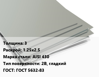 Лист нержавеющий 3 1.25х2.5 Сталь: AISI 430 Тип:2B, гладкий ГОСТ 5632-83