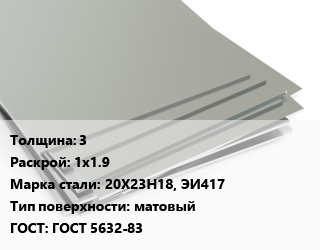 Лист нержавеющий 3 1х1.9 Сталь: 20Х23Н18, ЭИ417 Тип:матовый ГОСТ 5632-83