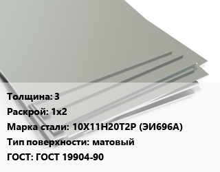 Лист нержавеющий 3 1х2 Сталь: 10Х11Н20Т2Р (ЭИ696А) Тип:матовый ГОСТ 19904-90