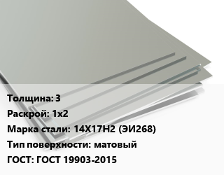 Лист нержавеющий 3 1х2 Сталь: 14Х17Н2 (ЭИ268) Тип:матовый ГОСТ 19903-2015