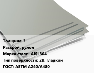 Лист нержавеющий 3 рулон Сталь: AISI 304 Тип:2B, гладкий ASTM A240/A480
