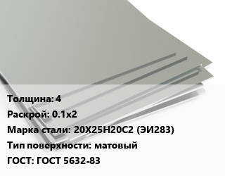 Лист нержавеющий 4 0.1х2 Сталь: 20Х25Н20С2 (ЭИ283) Тип:матовый ГОСТ 5632-83