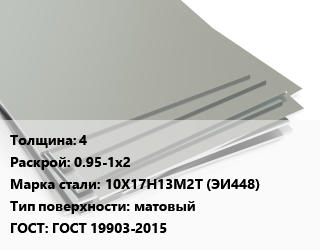 Лист нержавеющий 4 0.95-1х2 Сталь: 10Х17Н13М2Т (ЭИ448) Тип:матовый ГОСТ 19903-2015