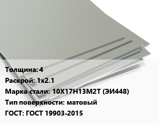 Лист нержавеющий 4 1х2.1 Сталь: 10Х17Н13М2Т (ЭИ448) Тип:матовый ГОСТ 19903-2015