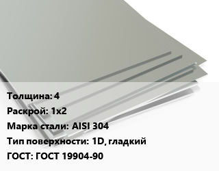 Лист нержавеющий 4 1х2 Сталь: AISI 304 Тип:1D, гладкий ГОСТ 19904-90