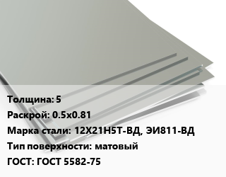 Лист нержавеющий 5 0.5х0.81 Сталь: 12Х21Н5Т-ВД, ЭИ811-ВД Тип:матовый ГОСТ 5582-75