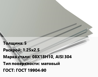 Лист нержавеющий 5 1.25х2.5 Сталь: 08Х18Н10, AISI 304 Тип:матовый ГОСТ 19904-90