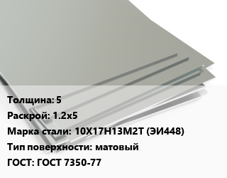 Лист нержавеющий 5 1.2х5 Сталь: 10Х17Н13М2Т (ЭИ448) Тип:матовый ГОСТ 7350-77