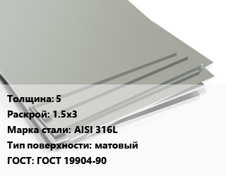 Лист нержавеющий 5 1.5х3 Сталь: AISI 316L Тип:матовый ГОСТ 19904-90