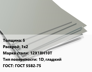 Лист нержавеющий 5 1х2 Сталь: 12Х18Н10Т Тип:1D, гладкий ГОСТ 5582-75