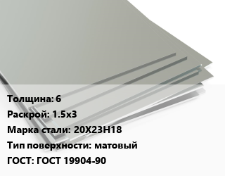 Лист нержавеющий 6 1.5х3 Сталь: 20Х23Н18 Тип:матовый ГОСТ 19904-90