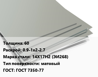 Лист нержавеющий 60 0.9-1х2-2.7 Сталь: 14Х17Н2 (ЭИ268) Тип:матовый ГОСТ 7350-77