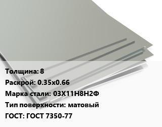 Лист нержавеющий 8 0.35х0.66 Сталь: 03Х11Н8Н2Ф Тип:матовый ГОСТ 7350-77