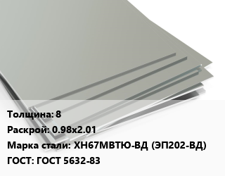 Лист нержавеющий 8 0.98х2.01 Сталь: ХН67МВТЮ-ВД (ЭП202-ВД) ГОСТ 5632-83