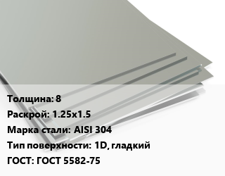 Лист нержавеющий 8 1.25х1.5 Сталь: AISI 304 Тип:1D, гладкий ГОСТ 5582-75