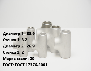 Тройник стальной 88.9х3.2 -26.9х2 Сталь: 20 ГОСТ: ГОСТ 17376-2001